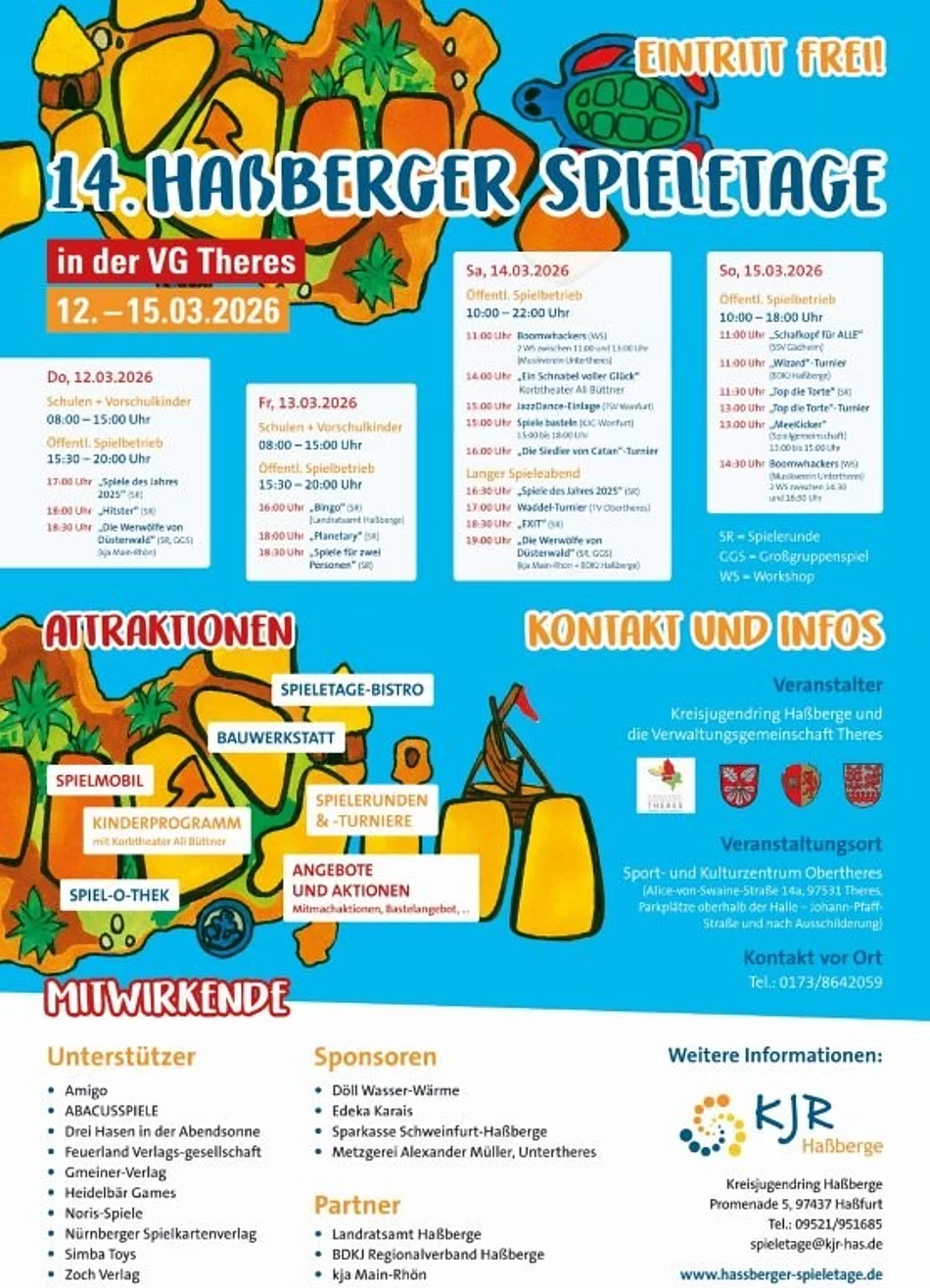 Vom 12. bis 15.03.2026 finden die Haßberger Spieletage in Obertheres im Sport- und Kulturzentrum Theres statt – ein familienfreundliches Großereignis mit überregionaler Strahlkraft. An mehreren Tagen werden Besucherinnen und Besucher aus dem ganzen Landkreis erwartet, um gemeinsam zu spielen, Neues zu entdecken und unsere Gemeinschaft zu erleben. Es werden auch Vereine der Gemeinden Gädheim, Wonfurt und Theres als Veranstalter zu finden sein.